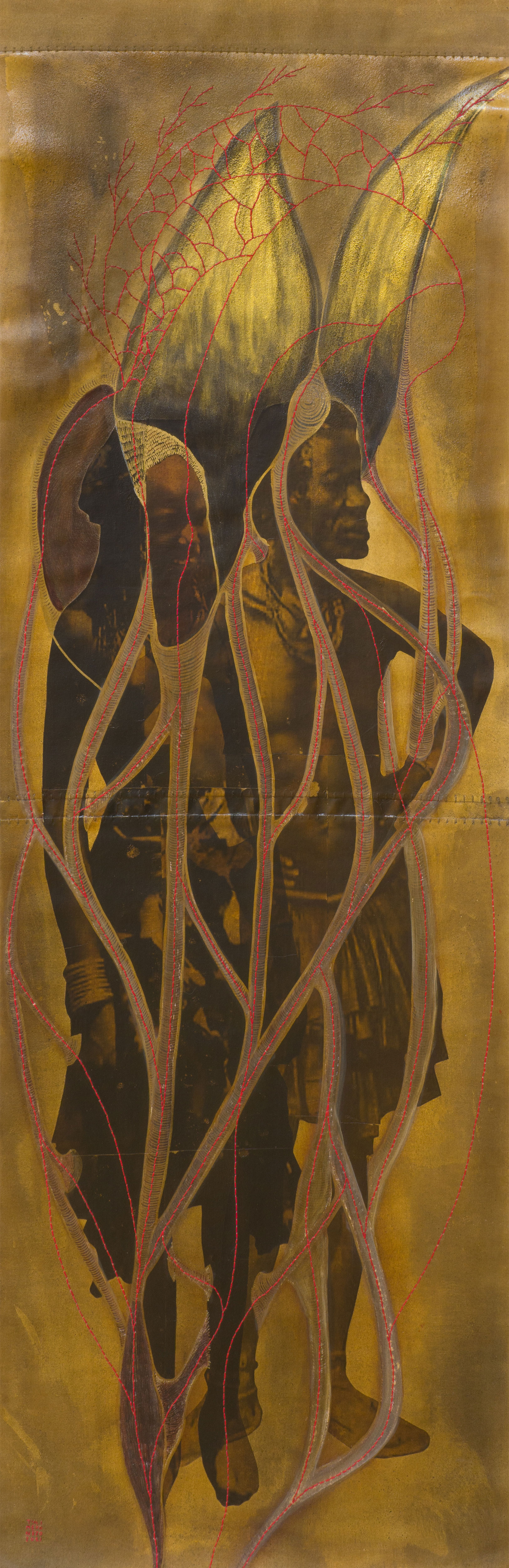 - Medium: Collage, mahangu, resin, acrylic gold paint, paint marker, acrylic ink, cotton embroidery thread on canvas