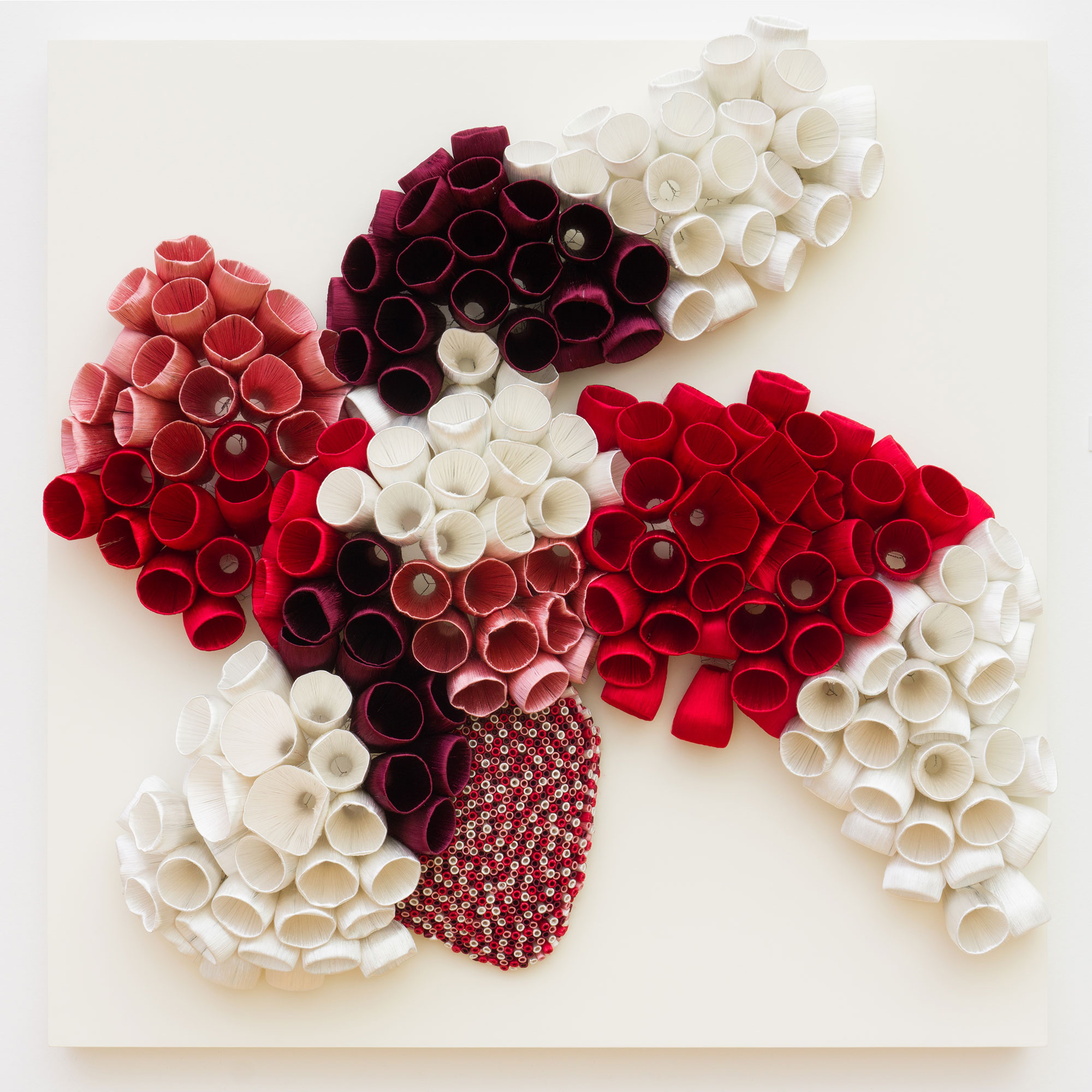 Silk, plastic bottles and plastic tubes on wire frame and wooden plate