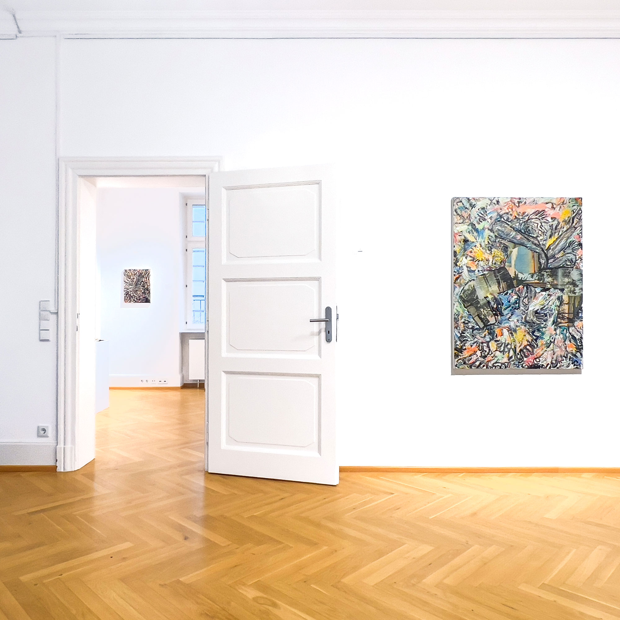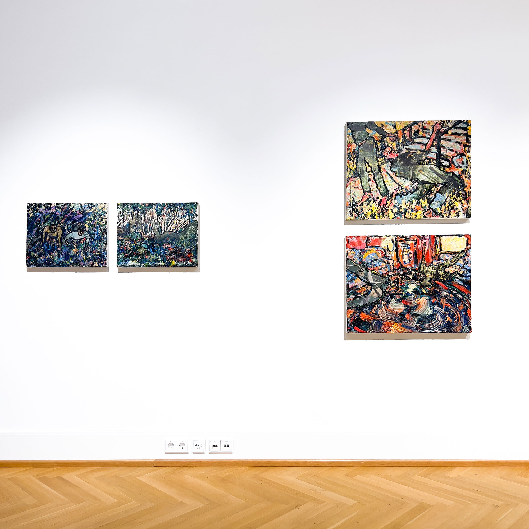 The title "Gravity" harkens to the vortex-like brush strokes in the compositions, with a shared density in their color palette and their motion densely nestled in swirling fields and portal-like floors. In metaphorical uses of the term "gravity," we can imagine different associations to gravitational pulls and its "thingness" which keeps us grounded or anchored to a place, even as we transform over time and move across space. Tied to genealogy and the mapping of genealogical traces, the physical effects of this "binding" or "pulling" intersect the metaphysical with the passing of time where the historical encounters meet the more visceral, immediate and emotive aspects of this enduring attraction to the soil and the ground beneath us.