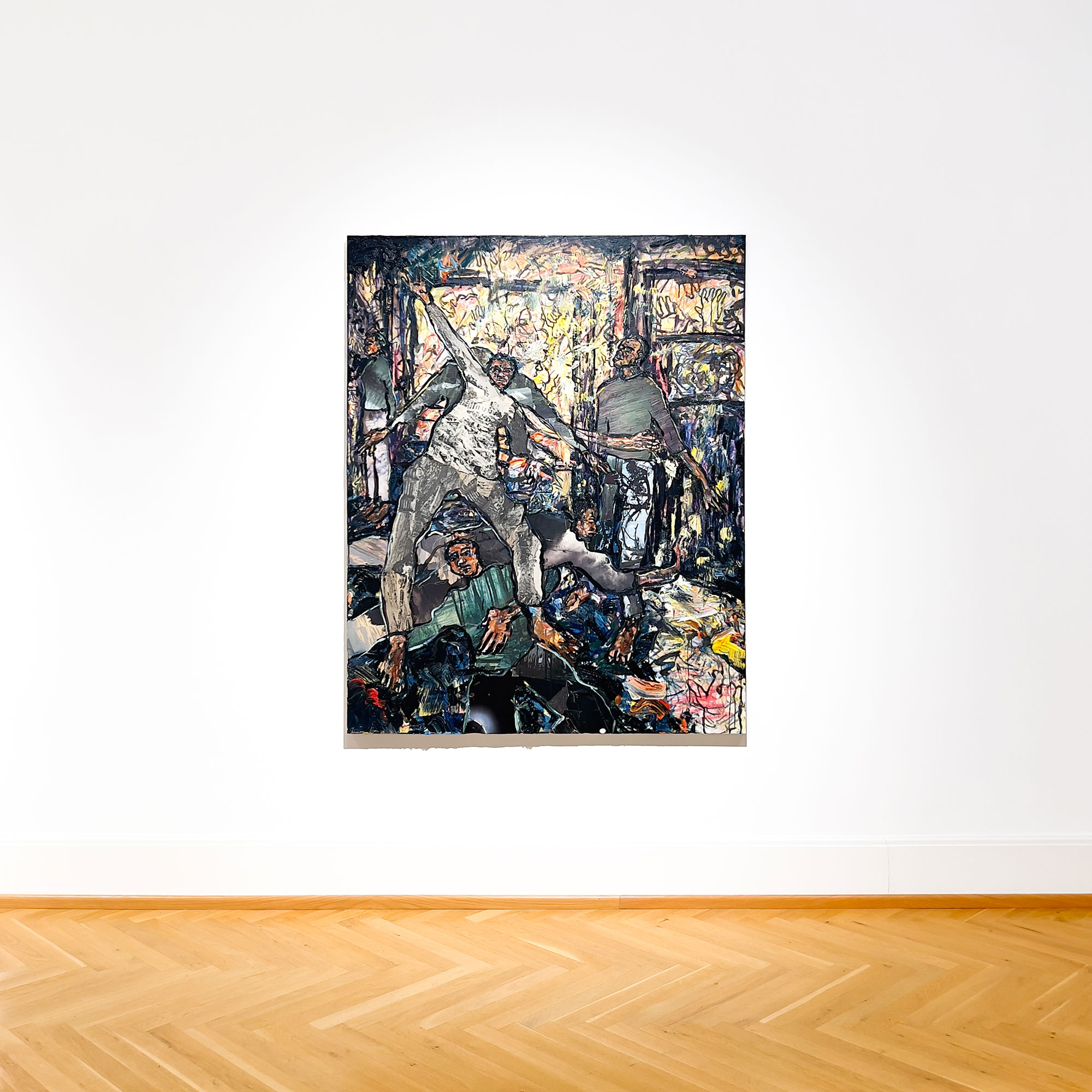 For this new solo show in Frankfurt, Mario Joyce created a body of work that focuses on genealogy and takes soil from the farm he grew up on in rural Ohio, mixing it with a dark base oil paint to create dense compositions in which abstracted figures made out of old archival photos from the region can be seen in motion: leaping, reaching, overlapping and visually embedded within the environment. Joyce developed this material alchemy with soil in his recently completed Pratt>FORWARD residency at New Lab in Brooklyn Navy Yard which was followed by an exhibition with UTA Artist Space in Atlanta, pushing his experimentation with soil as both living and historical matter and building it into his textured collage paintings.